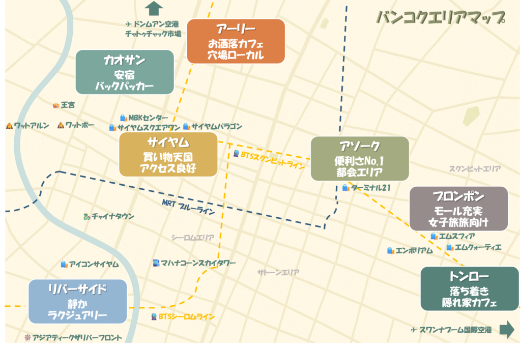 バンコクのおすすめ宿泊エリアについては、下記の記事で詳しく解説しています。ぜひ参考にしてみてください。👇
