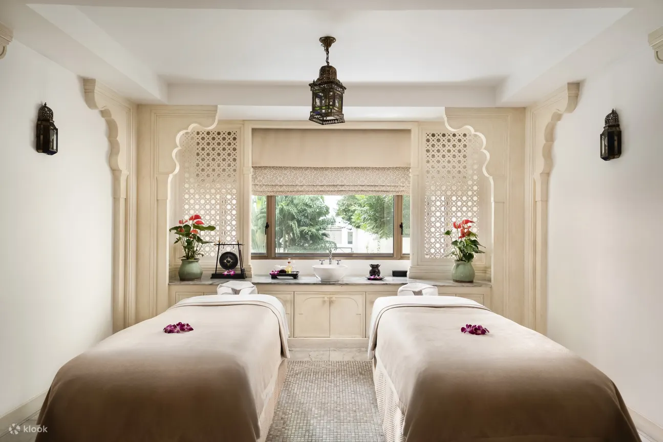 古代アジアの伝統的療法と現代ウェルネスを融合した高級スパ。個室スイートにはローマ風バスタブ付きで、落ち着いた照明とタイ様式のデザインが施されています。