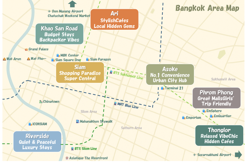 • Transport — Stay near BTS/MRT if you plan to move around a lot.
